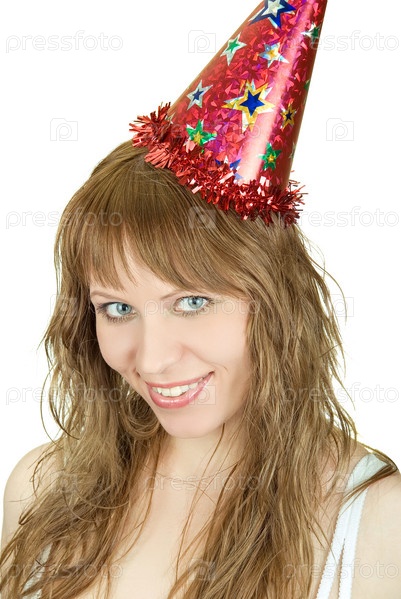 Красивая девушка в праздничном колпаке на белом фоне