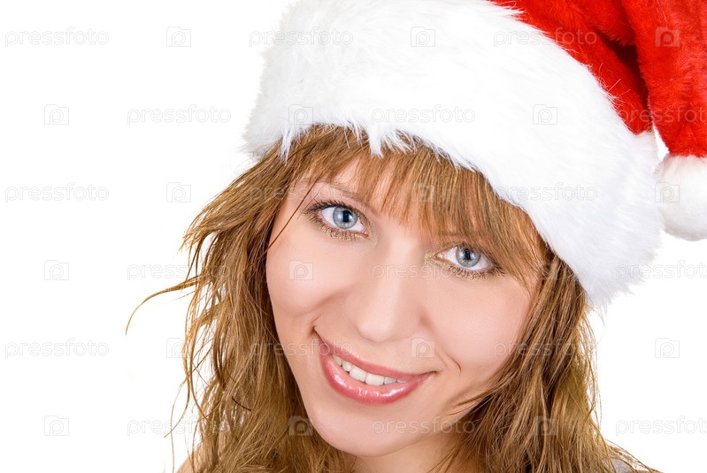 Красивая девушка в новогоднем колпаке на белом фоне