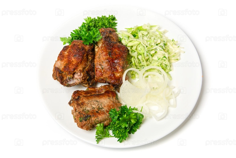 Запеченное на гриле мясо с овощами на тарелке на белом фоне