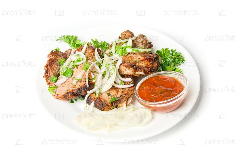 Шашлык с соусом и овощами на тарелке на белом фоне