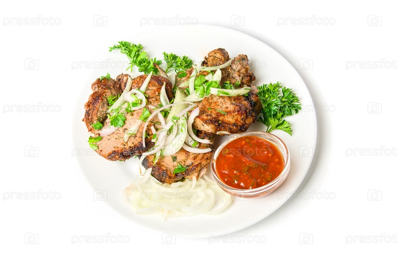 Запеченное на гриле мясо с соусом и овощами на тарелке на белом фоне