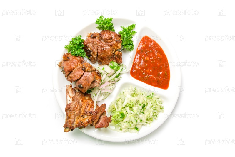 Запеченное на гриле мясо с соусом и овощами на тарелке на белом фоне