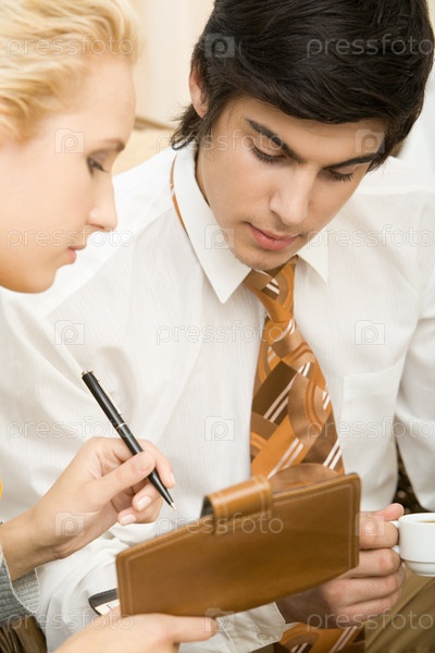 Близкий план молодого человека, смотрящего на блокнот в женском