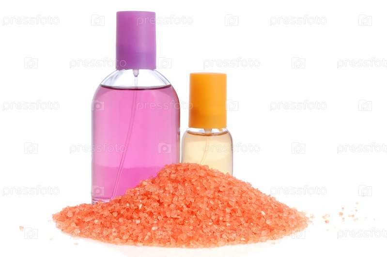 Флаконы с косметическими средствами и морская соль на белом фоне