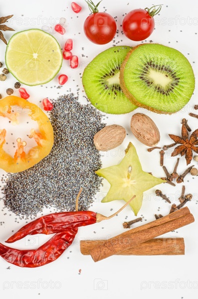 Красочные фрукты и специи на белом фоне