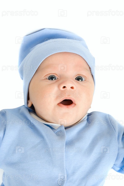 Портрет младенца в голубом костюмчике на белом фоне