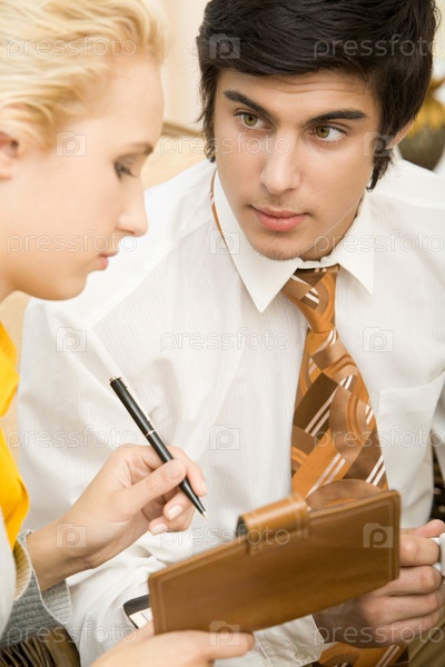 Портрет уверенного бизнесмена, смотрящего на своего партнера во время объяснения