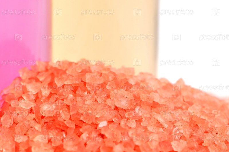 Флаконы с косметическими средствами и морская соль, крупный план