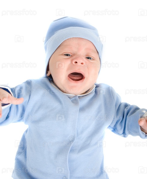 Портрет плачущего младенца в голубой одежде на белом фоне