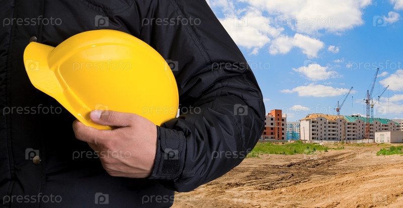 Желтая каска в руке строителя