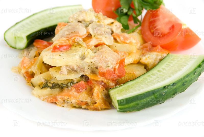 Крупным планом приготовленное мясо с картофелем, помидоры и огурцы