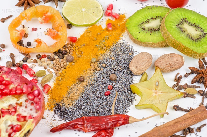 Специи и фрукты на белом фоне