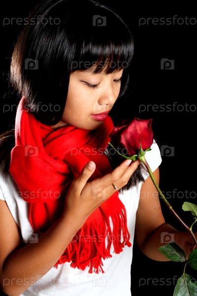 Портрет красивой девочки в красном шарфе с розой на черном фоне