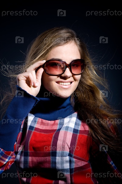 Фотомодель с длинными волосами в клетчатой одежде и темных очках