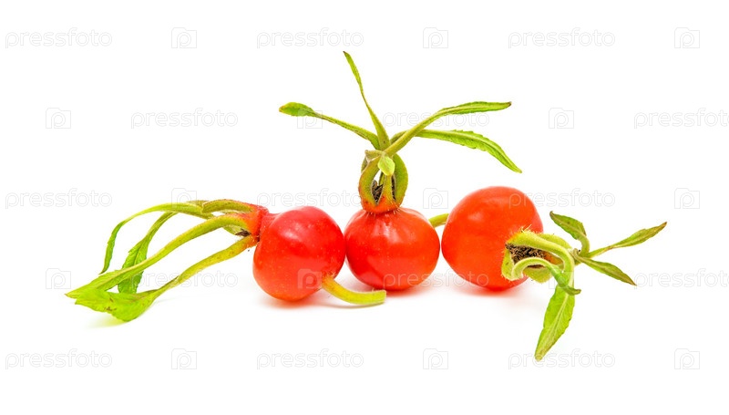 Три ягоды шиповника крупным планом на белом фоне