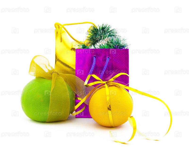 Цветные подарковые пакеты и группа цитрусовых на белом фоне