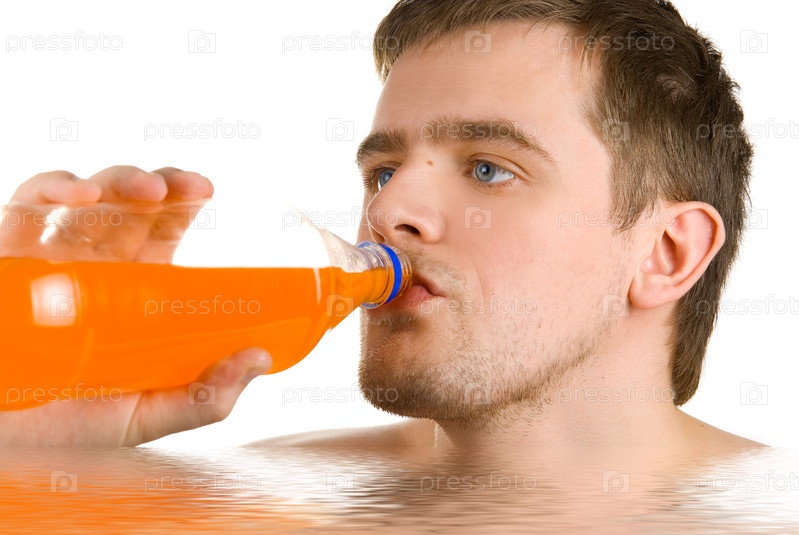 Мужчина пьет апельсиновый сок на белом фоне