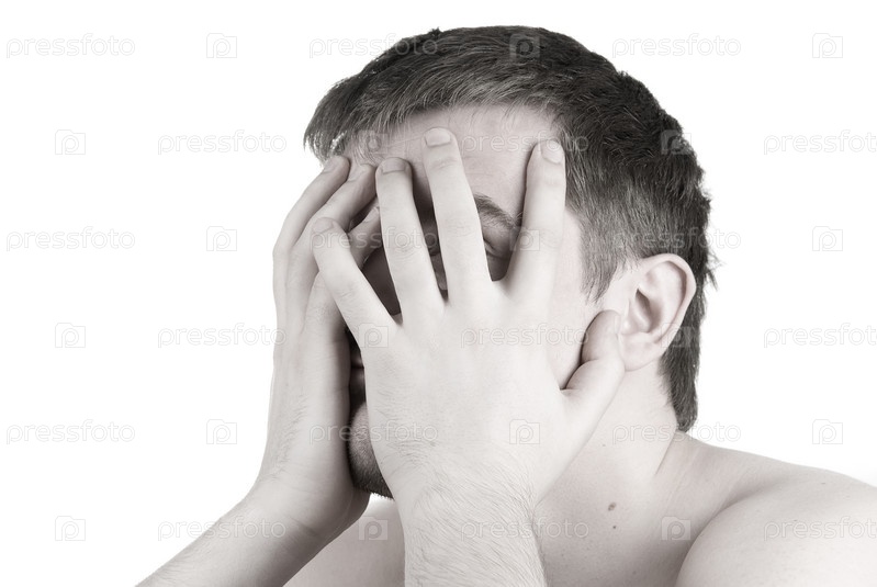 Портрет молодого человека, закрывшего лицо руками, на белом фоне