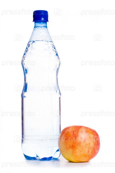 Яблоко и бутылка чистой воды на белом фоне