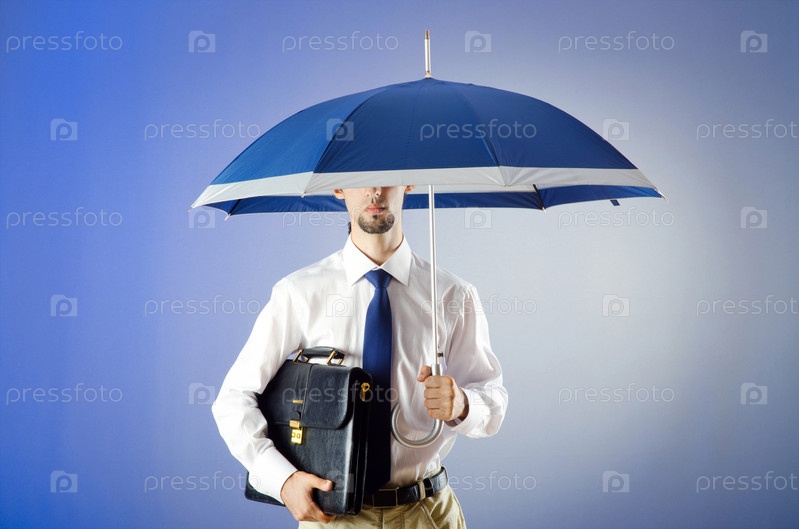 Бизнесмен под зонтом на синем фоне