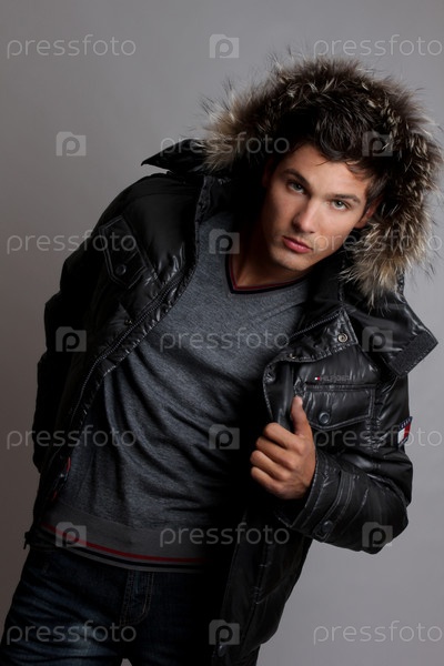 Парень в пуховике на сером фоне