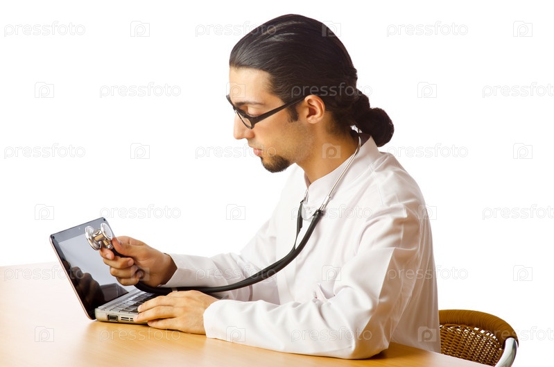 Молодой человек проводит компьютерную диагностику на белом фоне