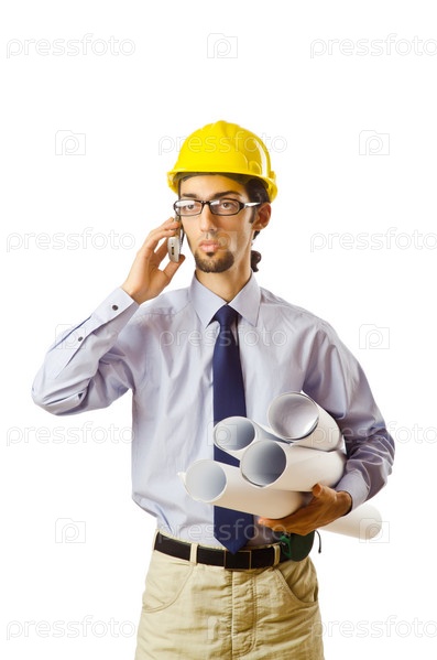 Инженер с чертежами разговаривает по телефону на белом фоне