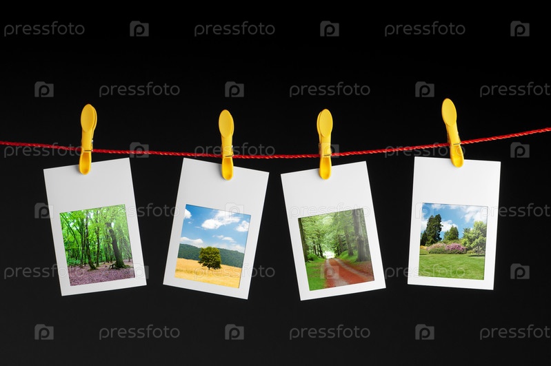 Четыре фотографии пейзажей на прищепках на черном фоне