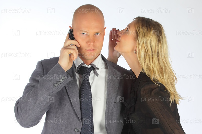 Счастливая женщина рядом с деловым мужчиной, изолированные на белом фоне