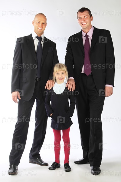 Двое счастливых деловых мужчин и маленькая девочка, студийный портрет