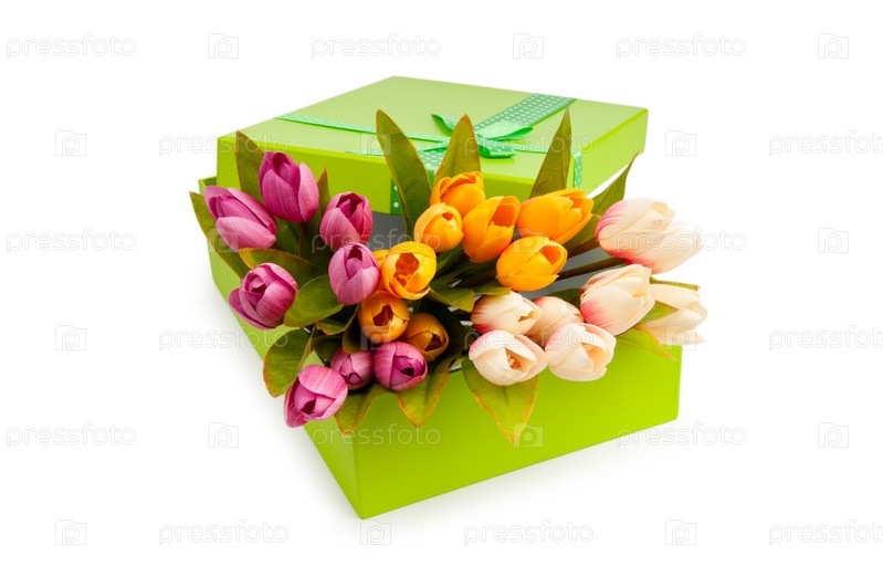 Подарочная коробка с тюльпанами на белом фоне