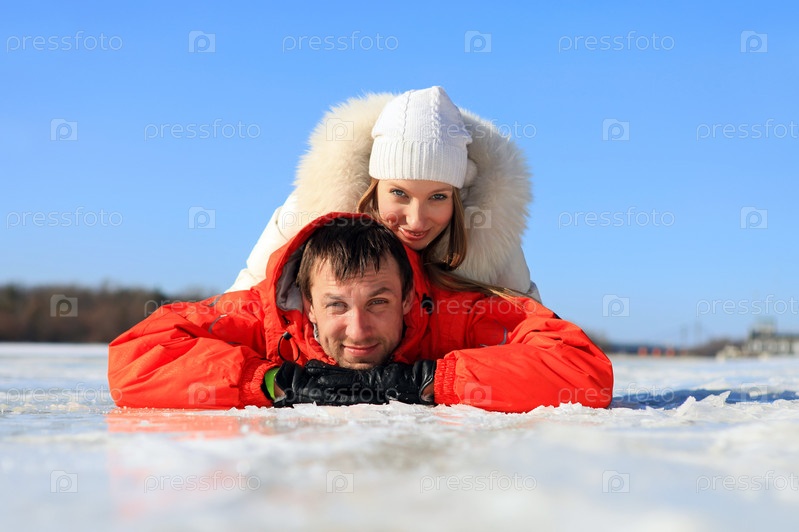 Счастливая молодая женщина и мужчина позируют, лежа на льду