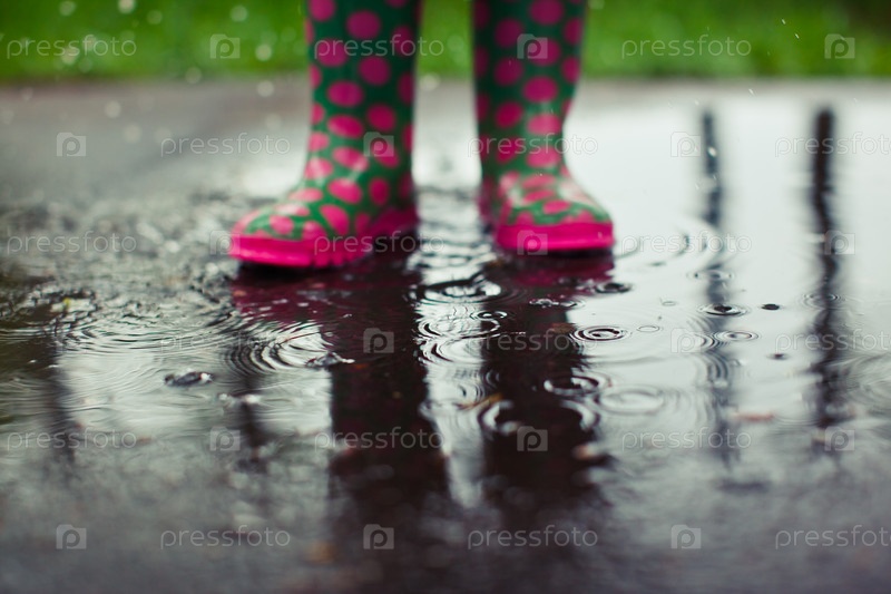 Детские ноги в ярких резиновых сапогах на мокром асфальте
