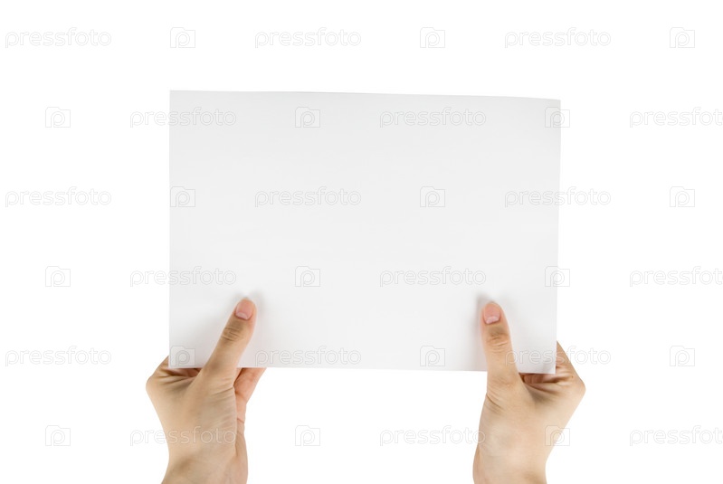 Чистый лист бумаги в руках на белом фоне