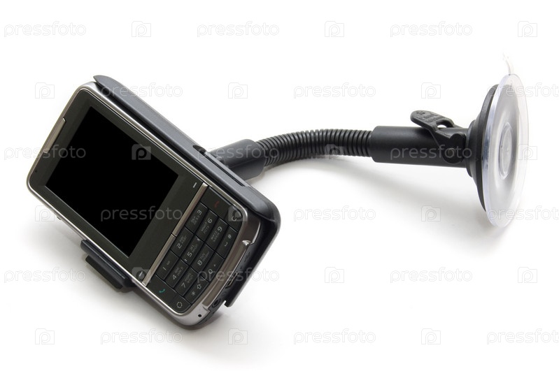 Коммуникатор в автомобильном держателе на белом фоне