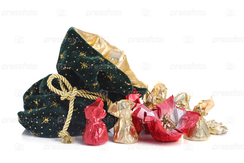 Новогодний мешок, полный шоколадных конфет, на белом фоне