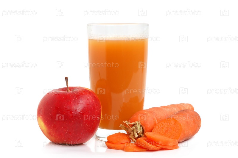 Стакан яблочно-морковного сока и свежие яблоко и морковь на белом фоне