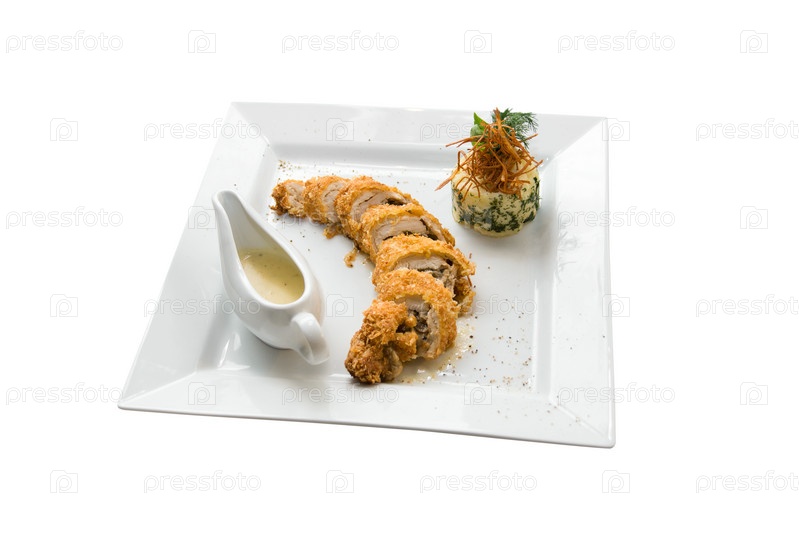 Блюдо из курицы на тарелке на белом фоне