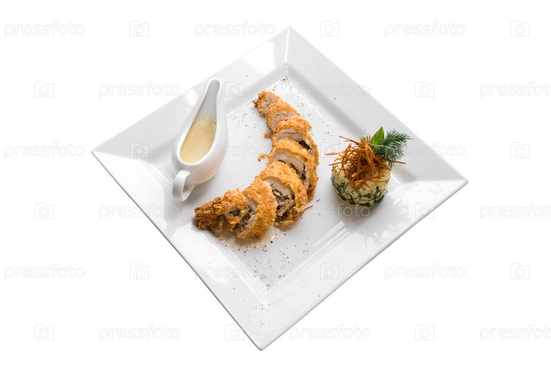 Блюдо из курицы на тарелке на белом фоне