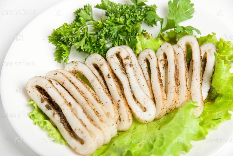 Ломтики кальмара и зелень крупным планом