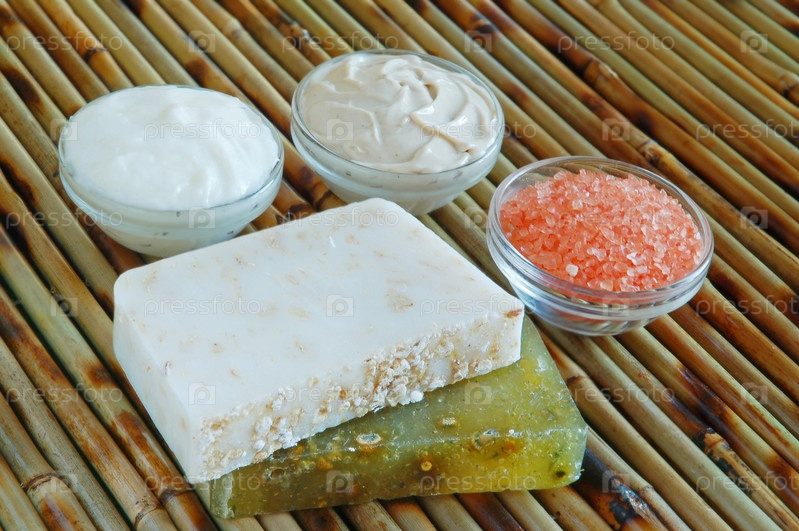 Мыло ручной работы, маска для лица, соль и крем для рук на бамбуковой циновке