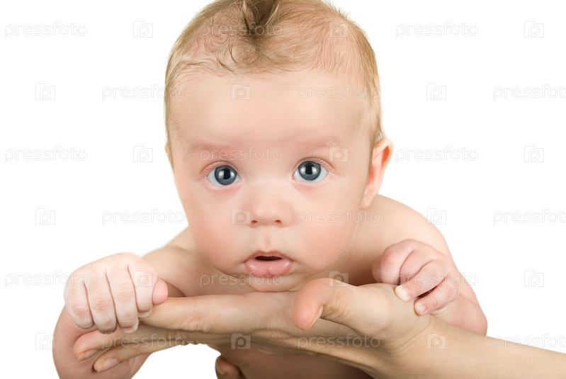 Маленький мальчик на руках крупным планом на белом фоне