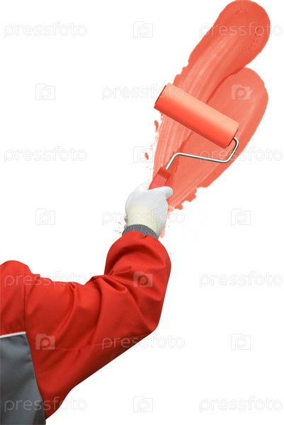 Рука человека, окрашивающего стену в красный цвет