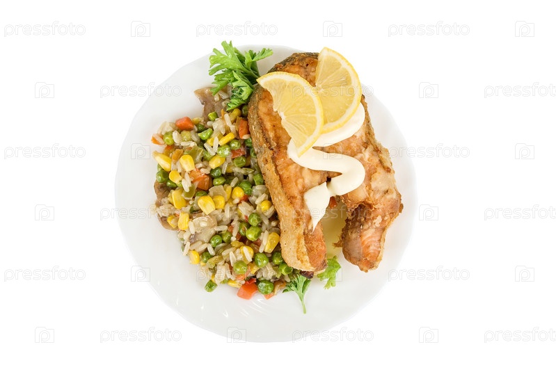 Блюдо из риса с овощами и жареной красной рыбы. Изолированное на белом фоне