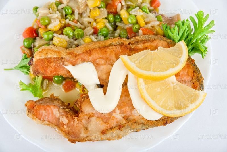 Блюдо из риса с овощами и жареной красной рыбы. Изолированное на белом фоне