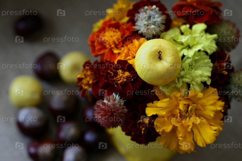 Краски осени. Натюрморт с яблоками (мелкоплодный сорт), садовыми цветами и каштанами (на заднем плане)