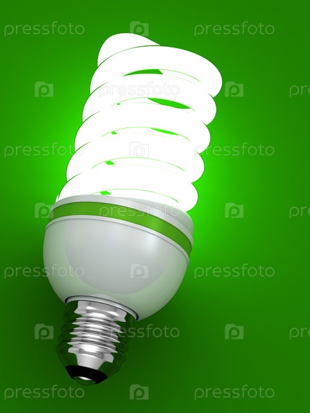 Горящая энергосберегающая люминесцентная лампочка на зеленом фоне