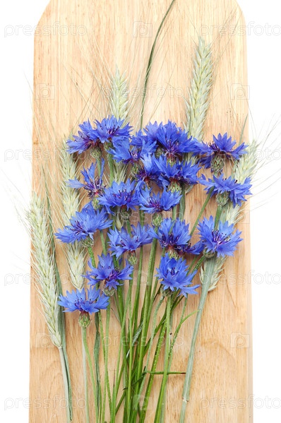 Букет васильков и зеленых колосьев на деревянном фоне