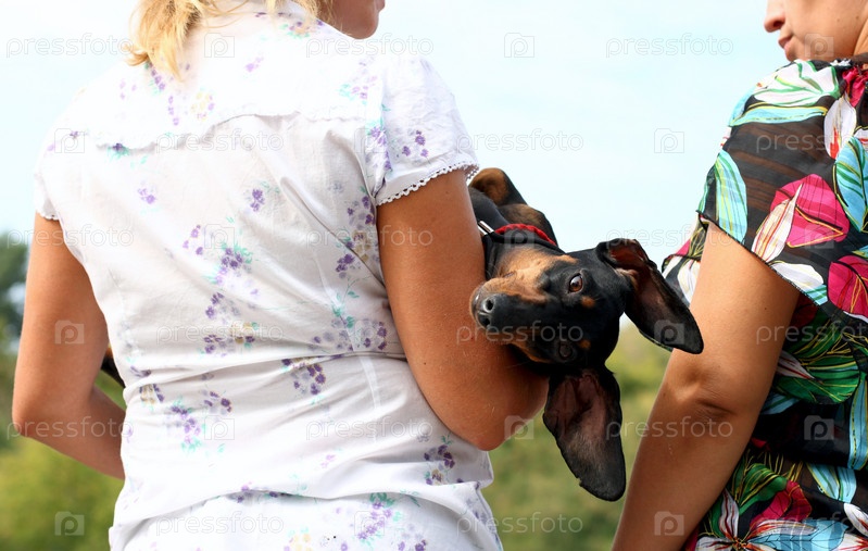 Разговор не обо мне. Такса лежит на руках хозяйки, свесив голову, и смотрит в объектив. Женщины заняты разговором между собой