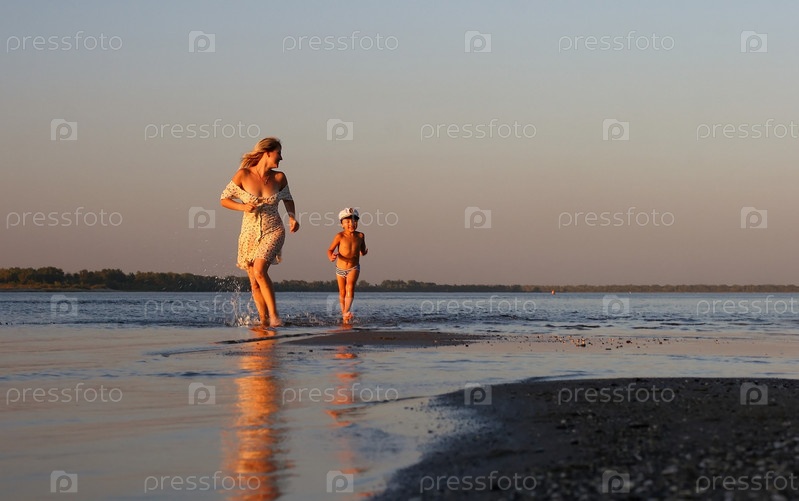 Мать с ребенком бегают на пляже